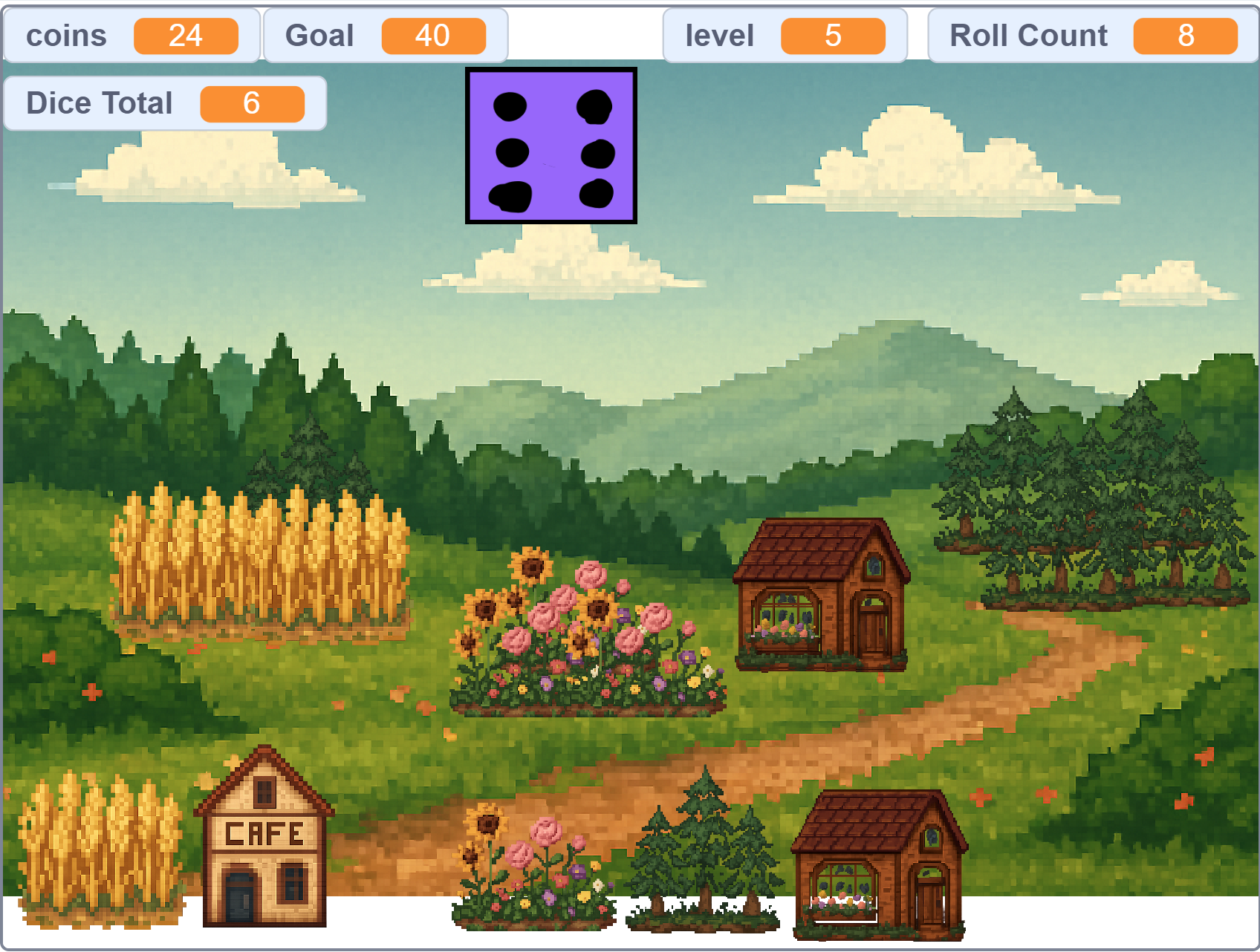 • When clicked, change the math to: set Dice Total to ((pick random 1 to 6) + (pick random 1 to 6)). This allows the player to finally hit high-number buildings like the Mine (11 or 12).