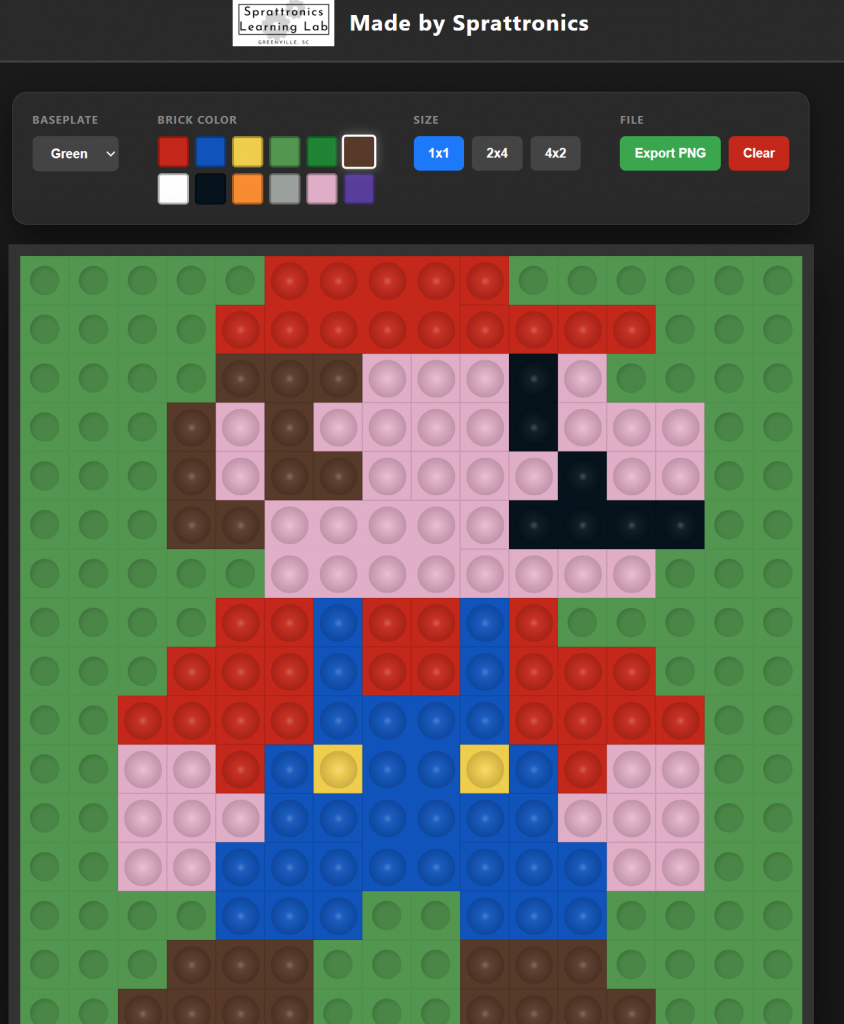 The Sprattronics LEGO Plate Builder is a user-friendly web app that allows you to design one-layer creations on a standard 16x16 baseplate. By restricting the build to a single layer, users are challenged to think about patterns, color theory, and spatial relationships—making it the perfect digital companion to physical brick building.